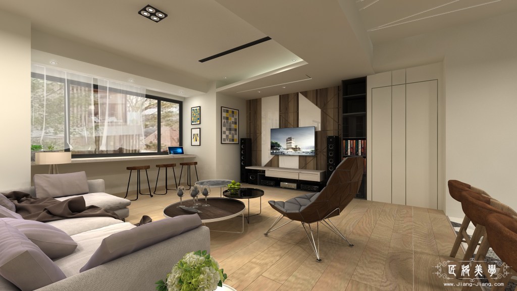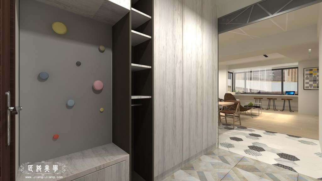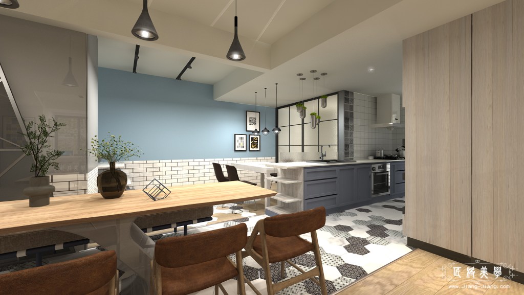 運用了北歐混合美式,做為整體風格的主軸,空間背景以訂製鐵件作為點綴,為了一飽高層樓美景,在窗邊設置吧台座位區,充分享受自然光線,使家中增添一處閱讀小憩的空間,成為凝聚家人在此對話、分享的最佳場域。