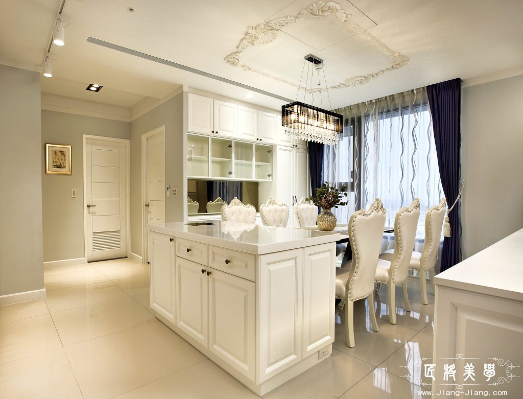 依循美式風格講究的純淨與溫暖,恰到好處的線板比例呈現出設計的細膩感,以明亮的色彩充滿生活感,石材、鏡面及鐵件異材質的相互關係,拉出低調的奢華。