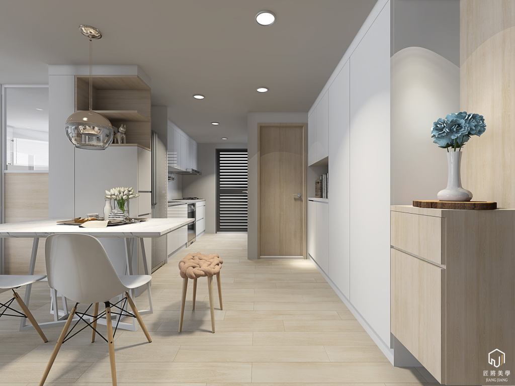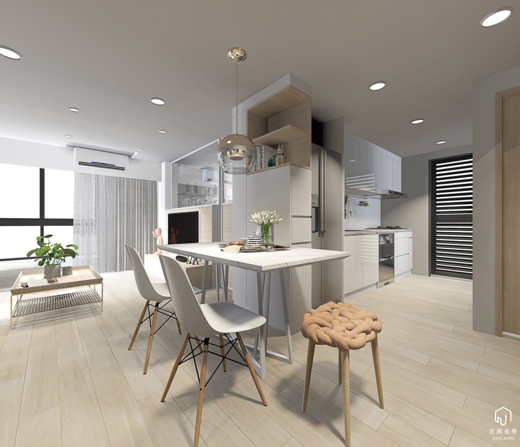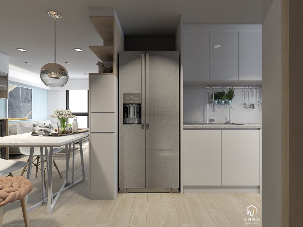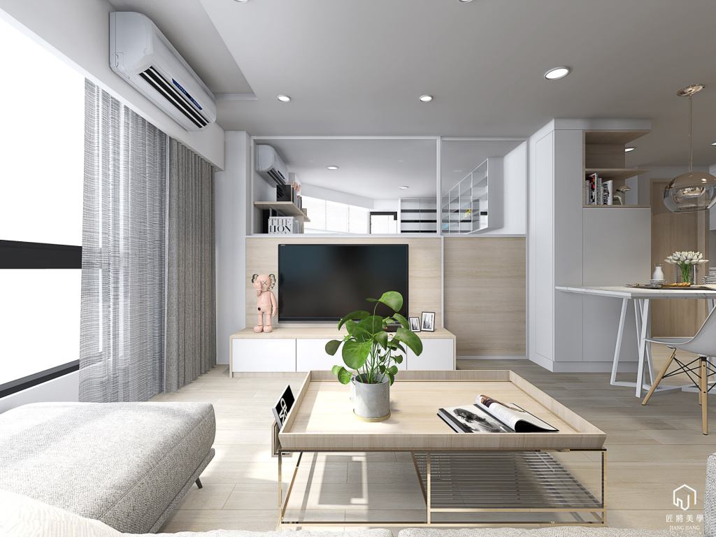 反向思考小空間表現大尺度,木質系勾勒打破格局封閉感,空間展延以色彩調區隔層次,量體層疊北歐語彙溫暖空間。