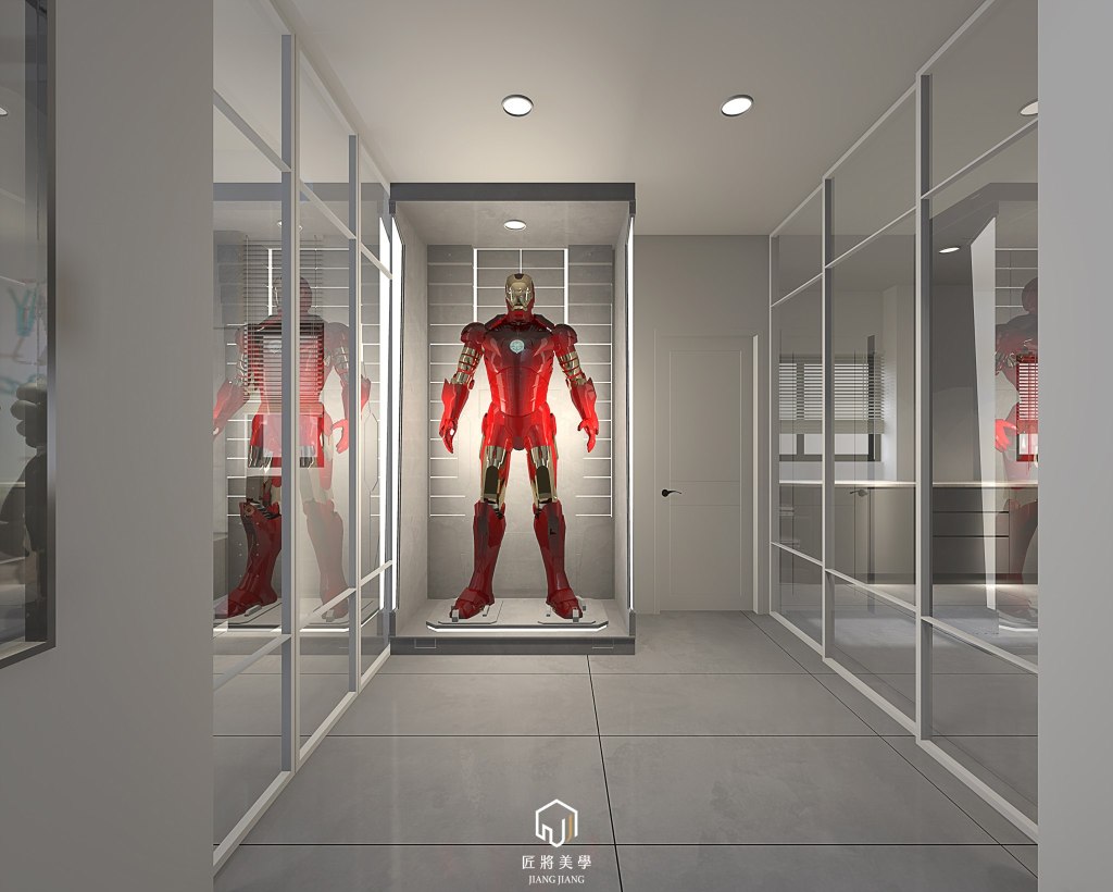 設計的時候畫了一架鋼鐵人,業主竟然花費鉅額買了回來,所以直接幫鋼鐵人打造個家,量身定做設計鋼鐵人格納庫。