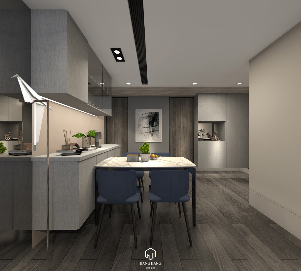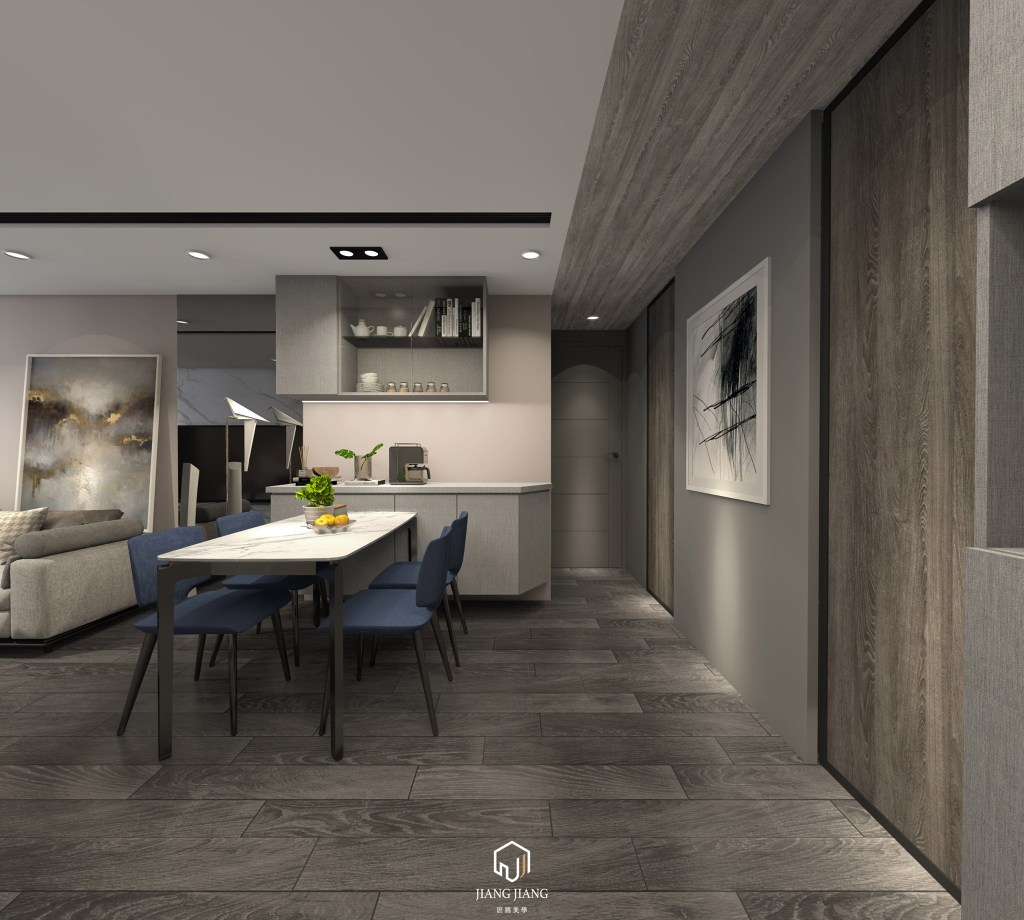 創造現實與抽象間的超現實境界,夢囈般形象結合古典與低調冷斂,現代格調呈現石紋大氣雅致氣質,灰色系形塑沉穩寧靜的表情色調,菱格紋湛藍色意趣點綴空間氛圍,色彩層次感呈現情感起伏與流動。